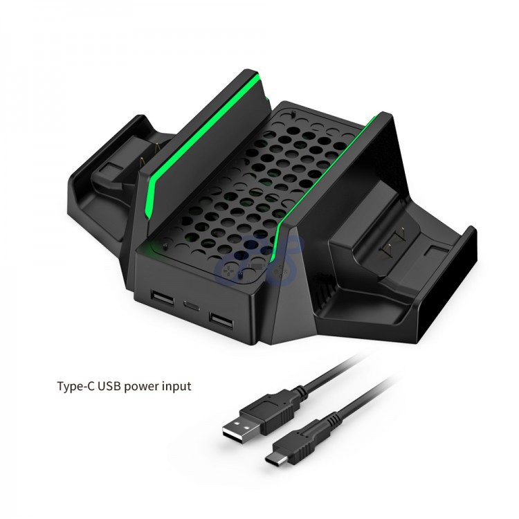 با استفاده از پایه چندکاره Dobe مخصوص ایکس باکس سری اس، شما میتوانید کنسول ایکس باکس سری اس را به صورت عمودی قرار داده و با استفاده از فنهای سریع و بیصدای این پایه، آن را خنک کنید. همچنین، این پایه دارای دو محل نگهداری و شارژ دسته ایکس باکس به همراه دو عدد باتری قابل شارژ برای ایکس باکس سری اس و دو عدد باتری قابل شارژ برای ایکس باکس وان است. این پایه دارای یک دکمه برای روشن و خاموش کردن فن، یک پورت USB برای شارژ و یک پورت USB برای اتصال لوازم جانبی به کنسول است.