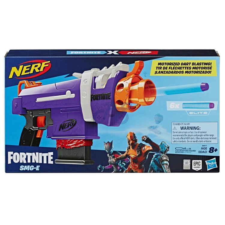 تفنگ اسباب بازی NERF SMG-E، بر اساس سلاحی به همین نام از بازی فورتنایت ساخته شده است. این سلاح اسباب بازی دارای یک خشاب با ظرفیت 6 گلوله دارت پلاستیکی است و میتوانید با پر کردن این خشاب، با این سلاح بازی کنید. این اسباب بازی با باتری کار میکند و با هر بار شلیک، یک دارت شلیک میکند. این اسباب بازی محصولی از کمپانی NERF، از زیرشاخههای Hasbro و با همکاری بازی فورتنایت است و تا 27 متر برد دارد.