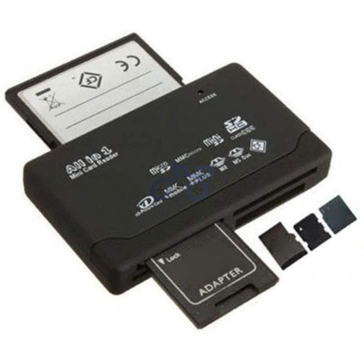 آداپتور چندکاره به شما این امکان را میدهد تا انواع کارتهای حافظه را با USB به کامپیوتر خود وصل کنید و محتویات آنها را مشاهده کنید. این آداپتور دارای چراغ LED برای نمایش وضعیت و USB 2.0 است و از کارتهای TF، CF، SD، Micro SD، SDHC، MMC، MS، XD و سایر کارتها پشتیبانی میکند.